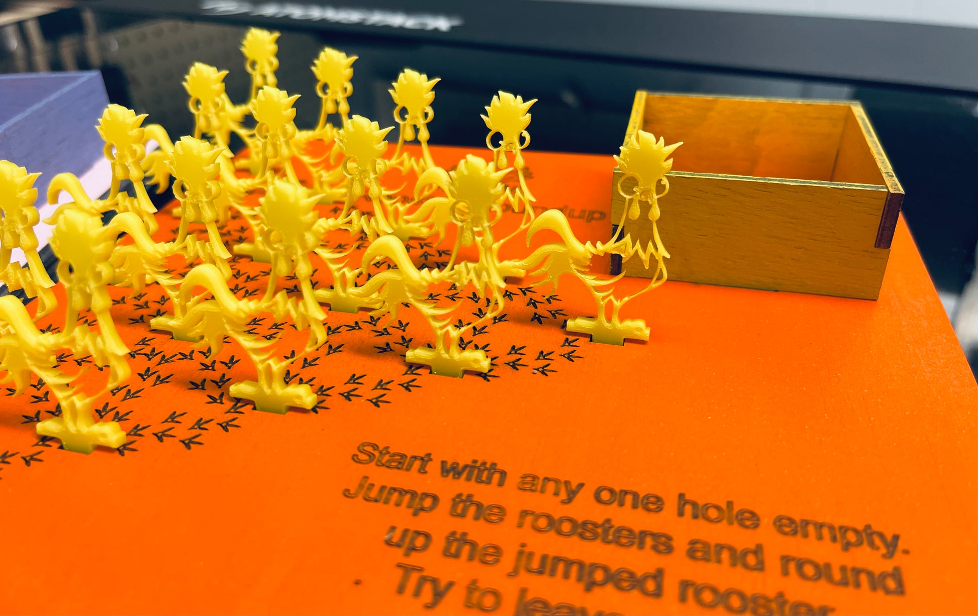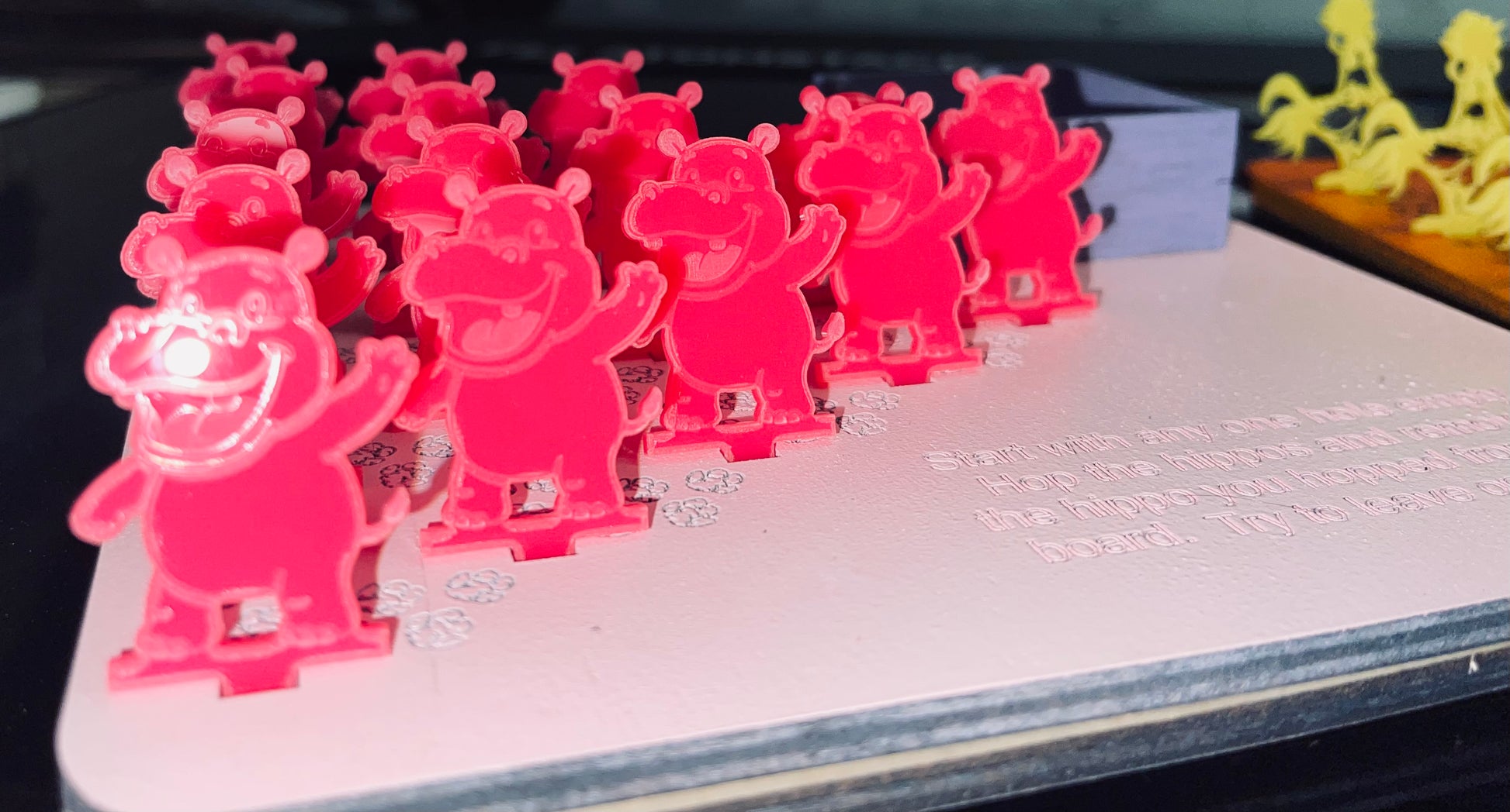 "Leap Frog", "Rooster Round Up" and "Hippo Hop" . These games have wooden game boards and acrylic pieces. These games are really cute. They come in a variety of colors.