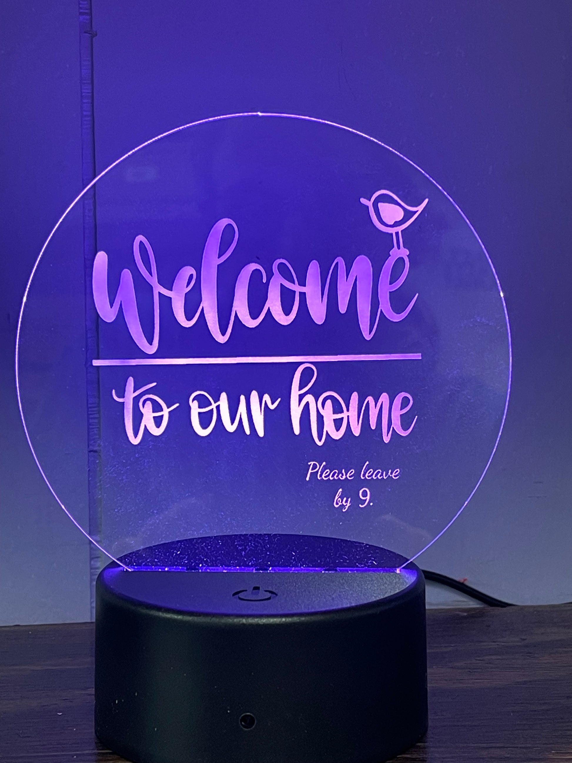 These lamps feature a small, led, color changing base and a 3mm thickness acrylic insert with a aser engraved image. They are powered by a USB cord, and come with a remote to control the lamp. We also offer a larger 6mm thickness acrylic lamp with laser engraving and a single color led wooden base.